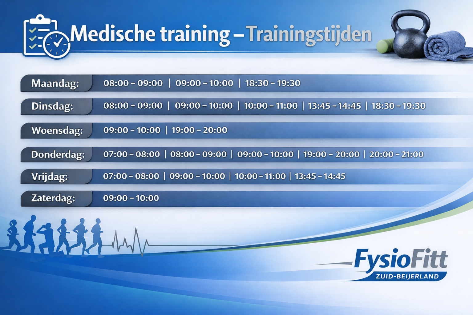 Tijdens medische training werken we gericht aan het verbeteren van verschillende onderdelen van uw lichamelijke conditie, zoals: